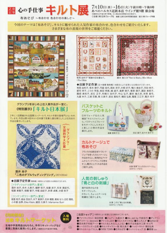 あべのハルカス近鉄本店 「2019心の手仕事キルト展」 7月10日~